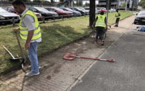 Ytterligare en varm het soldag 27 grader. Vi tar bort ogräs och sopar rent i rännsten och runt refuger på Göteborgs och Stationsvägarna. Dessförinnan går vi hela området och samlar in fimpar och skräp. Vi rensar även igenvuxna stigen nere vid Säveån från Häradsbron och upp till Växtrums plantering Brobacken 10.