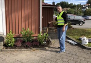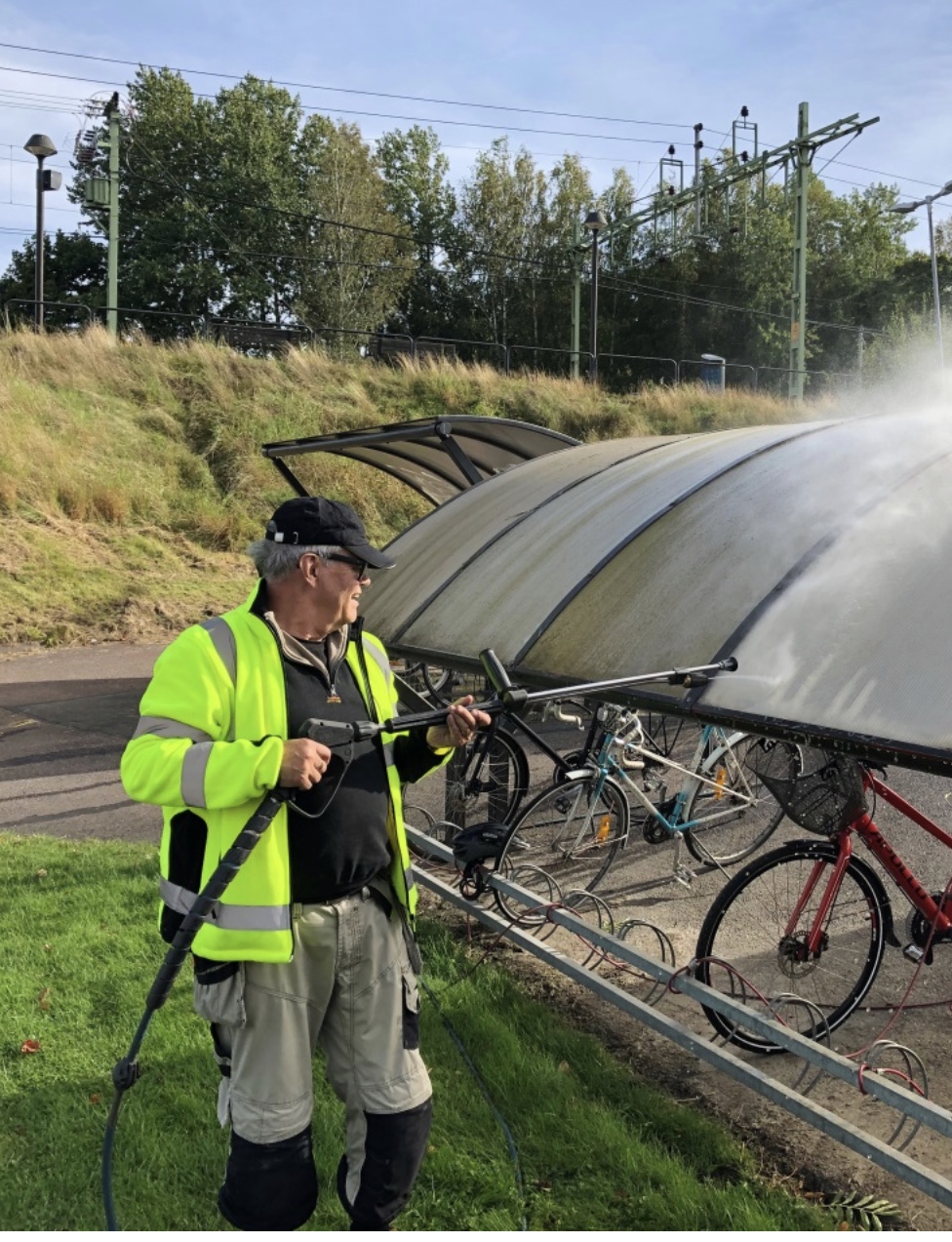 En solens dag, men lite sval morgon endast sju grader varmt. Idag fick vi två nya och efterlängtade deltagare, Iryna och Ardalan, till arbetslaget. Efter utprovning av arbetskläder börjad vi dagen med en gemensam frukost hos Systrarna Fast, vi fick lyssna på Centrumledaren Marianne Sörling om vad som spännande händelser framöver. Därefter började vi bygga rullställning för tvätt av plasttaket runt torget. Vi kunde inte låta blir att även testa högtryckstvätten att göra rent de grönbevuxna cykeltaken nere vid Aspedalens Station. En oerhört tacksam uppgift, taken blev så fina. Mohamad fortsatte måla dörr vid stationen samt plantera nya buskar och ljungplantor utanför vår dörr vid Moset.