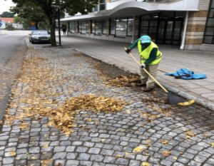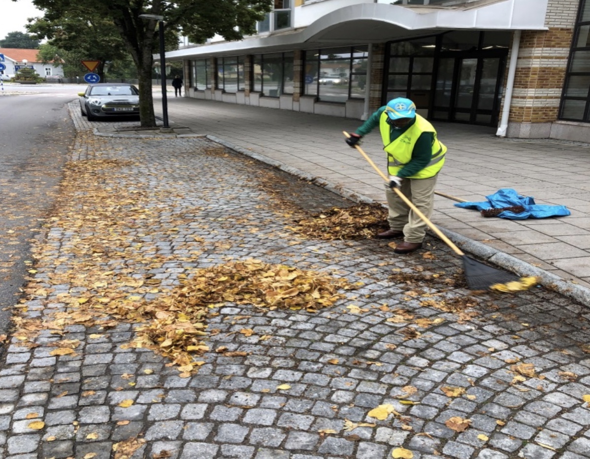 Solsken över Lerum höstlöven börjar falla. Vi sopar upp löv Runt Bagges Torg, Lerums station samt Brobackens fickparkeringar. Under eftermiddagen målar vi dörr på El centralen vid Lerums station samt två ofräscha papperskorgar på vägg i tunneln till tågen. En ungdom står o röker inom rökning förbjudet område, hen vill inte acceptera min tillsägelse, utan går till verbalt angrepp. (Vederbörande har tidigare bråkat men då gick hans lärare som av en händelse befanns sig på platsen in o bad eleven lägga av). Trist med ungdomar som inte vill visa hänsyn.