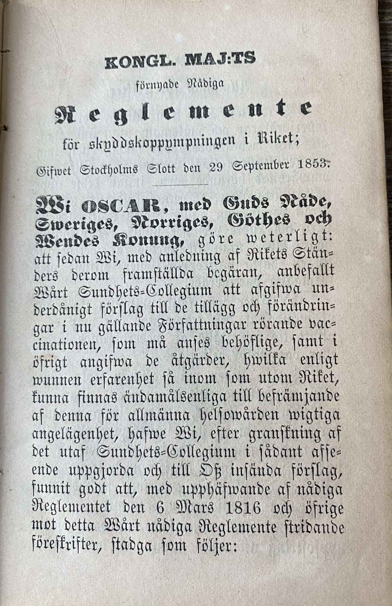 Senast har kunglig majestät år 1853, med föranledande av rikets ständer därom framställda underdåniga begäran och enligt kungliga sundhets kollegiets underdåniga förslag, med upphävande av förut gällande nådiga reglemente för vaccinationer, utfärdat följande reglementet för vaccinationer: