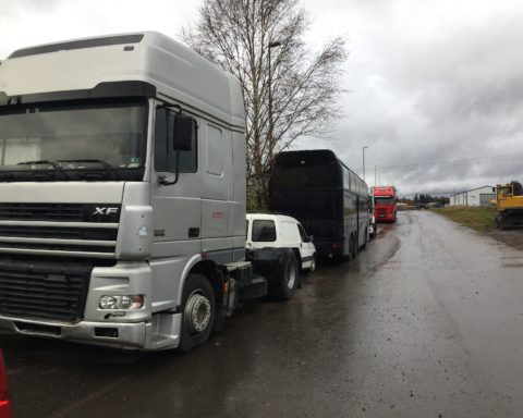 På Lekstorps Industriväg råder vild parkering. Sedan ett halvår står där, trots parkeringsförbud, ett antal lastbilar och en buss. Fordonen, varav