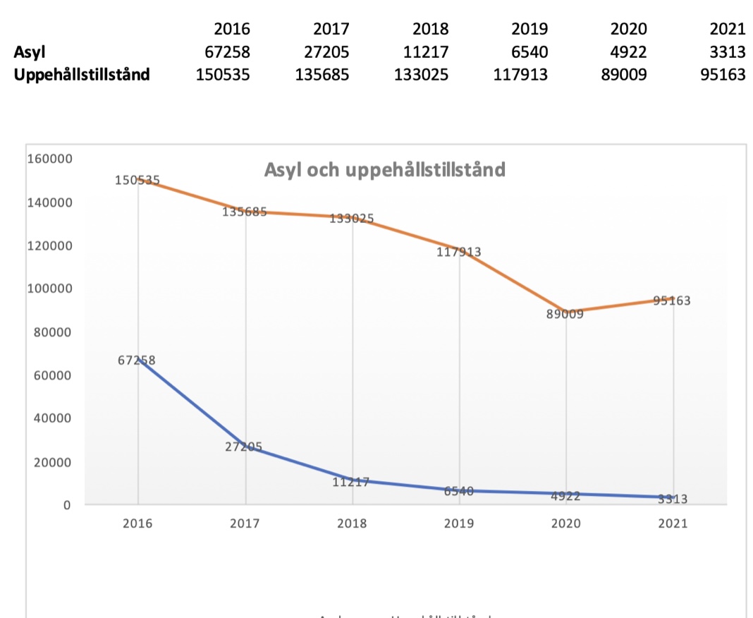 I valdebatten har migrationsfrågorna tagit stor plats. Här nedan lite siffror från Migrationsverket och Statistiska centralbyrån (SCB). Uppgifterna om uppehållstillstånd innefattar alla som sökt uppehållstillstånd, dvs även studenter, forskare, eu-medborgare m fl. Antalet beviljade asylansökningar har sjunkit från 67 258 år 2016 till 3 313 år 2021. Klicka här.